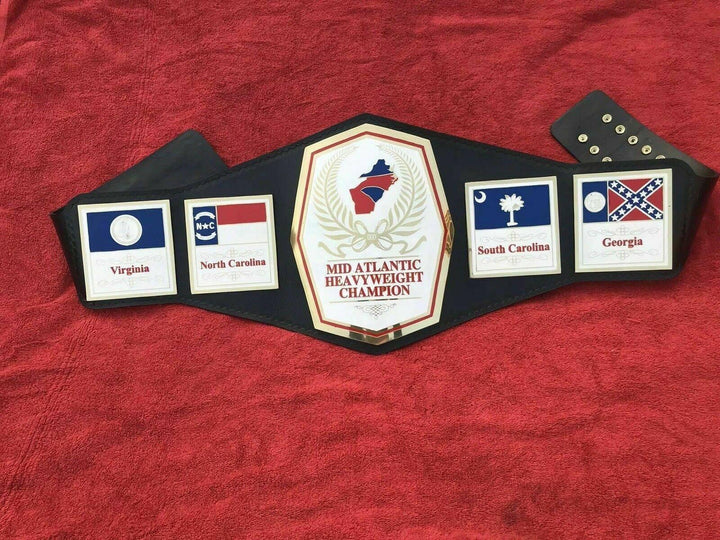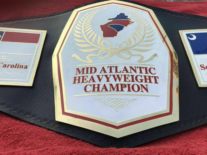 MID ATLANTIC HEAVYWEIGHT Championship Title Belt Get your hands on the MID ATLANTIC Heavyweight Championship Title Belt. This replica title belt is hand-crafted to replicate the same design and feel of the original. Made with single-layered brass and real cowhide leather, this belt will make you feel like a champion!