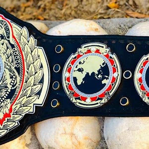 The belt is paired with a premium leather strap designed for durability, flexibility, and comfort. Its smooth surface, reinforced stitching, and adjustable snap fasteners ensure a secure and customizable fit for various waist sizes. The combination of solid brass plates and a sturdy leather strap provides a realistic weight and feel, closely resembling an authentic championship title used in professional wrestling. Whether displayed in a collection, worn for cosplay, or showcased as a centerpiece, this belt delivers a strong and eye-catching presence.