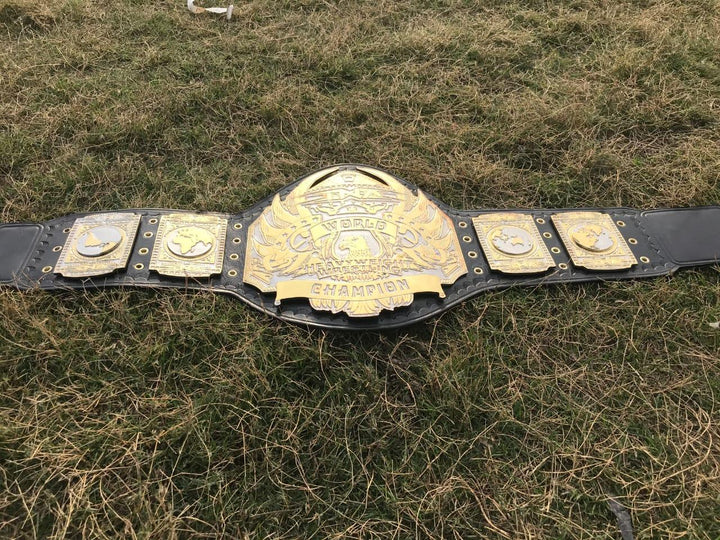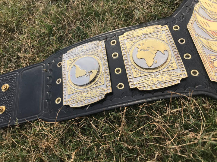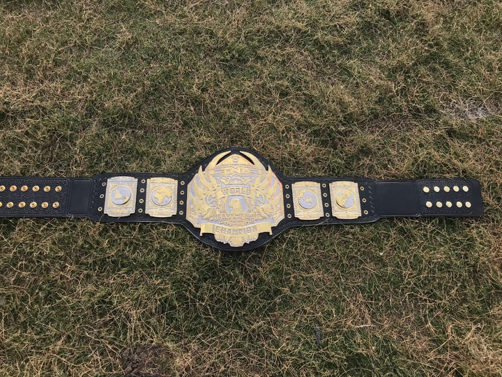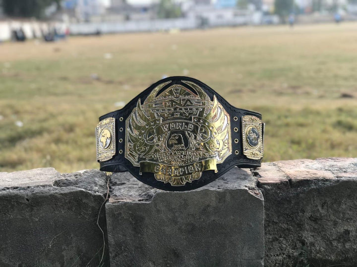 The TNA Heavyweight 24K Gold Championship Belt is a stunning tribute to wrestling excellence and legacy, designed for both collectors and passionate fans. Crafted with premium materials, the belt features plates plated with 24K gold, giving it a radiant, luxurious shine that instantly commands attention. The central plate proudly displays the iconic TNA logo, intricately engraved with fine details and accented with elegant designs that symbolize championship prestige and honor. Its bold, eye-catching look is complemented by the carefully designed side plates, each featuring intricate motifs that celebrate the sport’s history and the legacy of past champions.