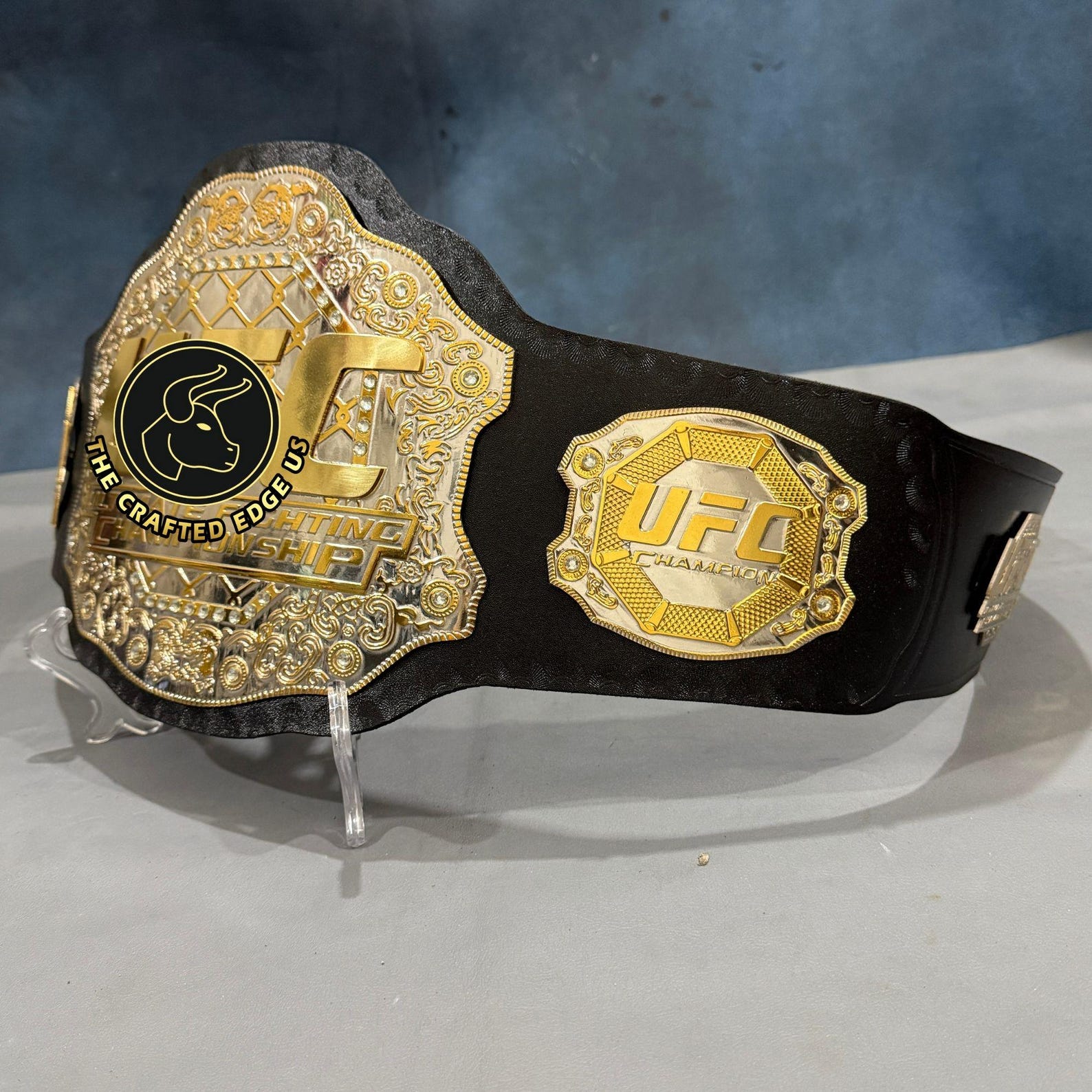 The side plates complement the central design with finely detailed motifs that celebrate the legacy and history of UFC champions. Mounted on a strong and flexible leather strap, the belt ensures durability while maintaining comfort for ceremonial wear or display purposes. Its robust construction allows it to hold its shape over time, making it ideal for collectors who want both authenticity and long-lasting quality.