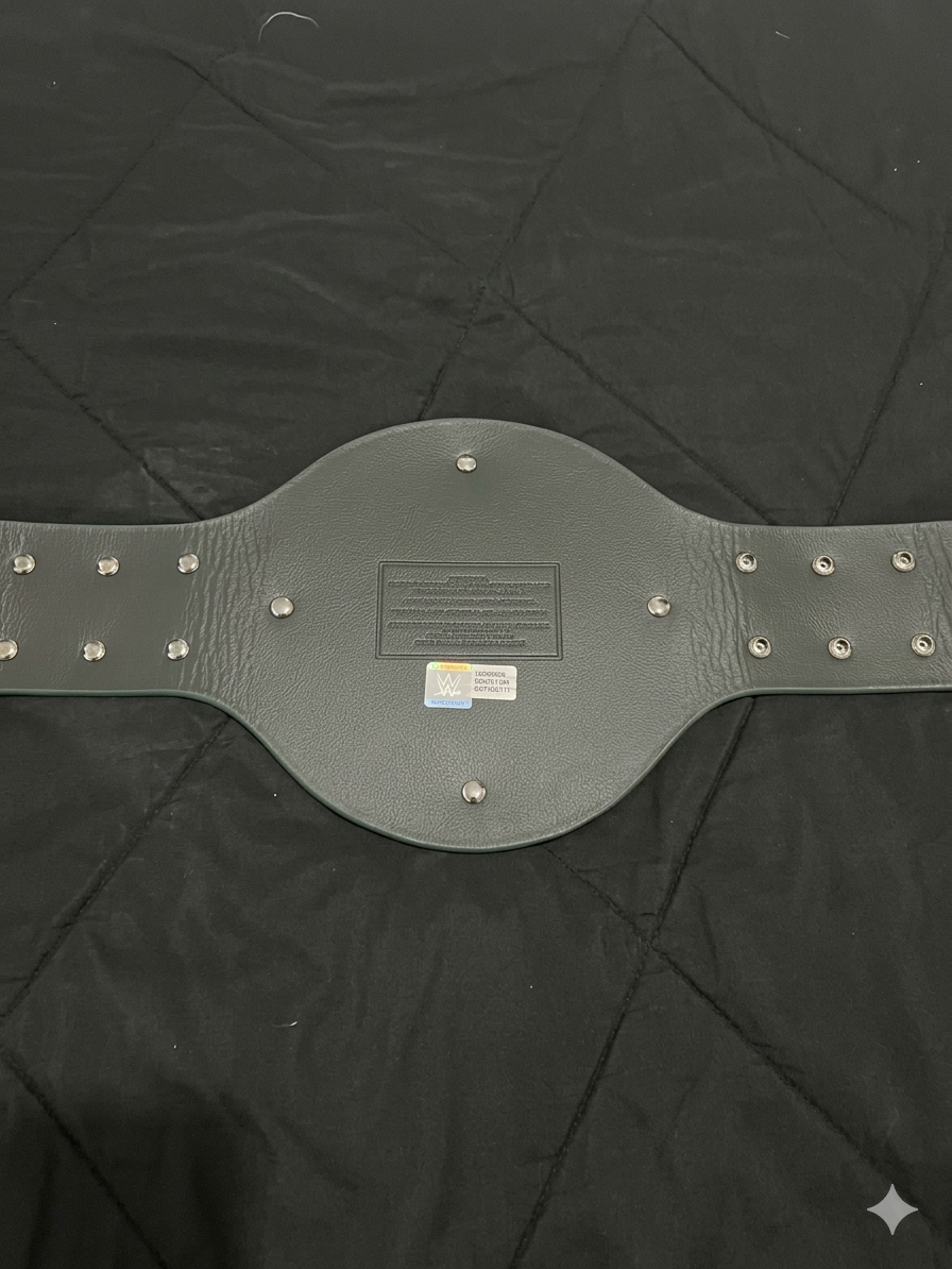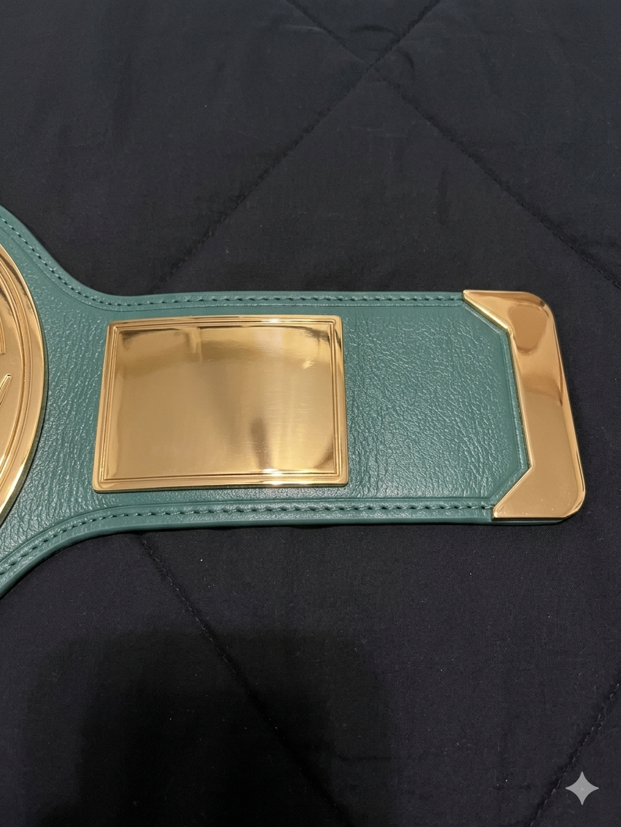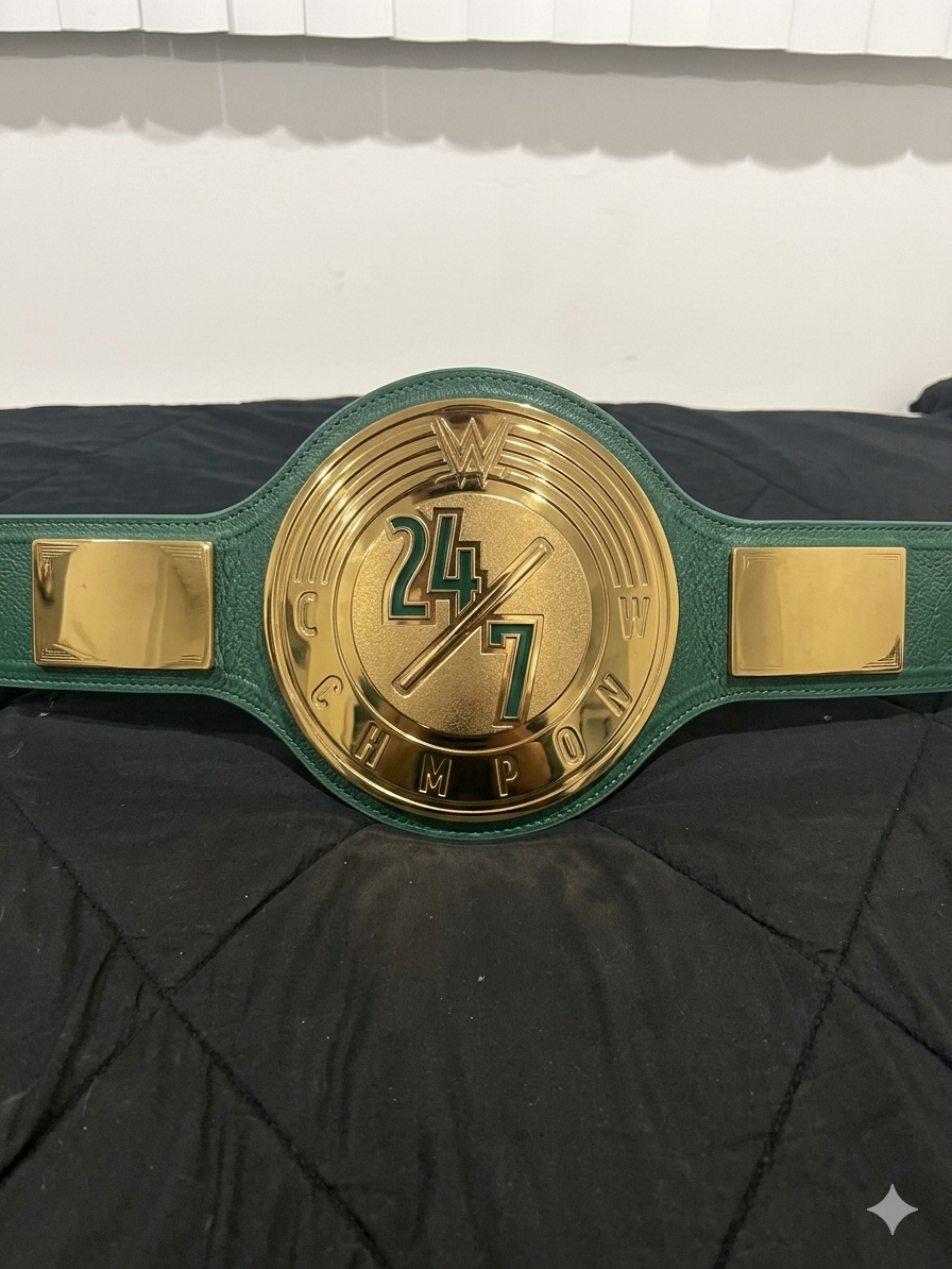 Unlike the ornate, gold-heavy designs of WWE’s premier world titles, the 24/7 Championship was intentionally distinct. The belt featured three gold-colored plates mounted on a green leather strap, a choice that made it instantly recognizable. The circular center plate prominently displayed the “24/7” branding in bold green lettering, with the WWE logo affixed at the top and the word “CHAMPION” arched along the bottom edge. The side plates were rectangular and relatively simple in design, intentionally kept blank of customizable logos—a necessity given that many title reigns lasted only minutes or even seconds. Because the title was built for a fast-paced, “grab-and-go” style of competition, its design leaned into functionality and visibility rather than traditional championship opulence.